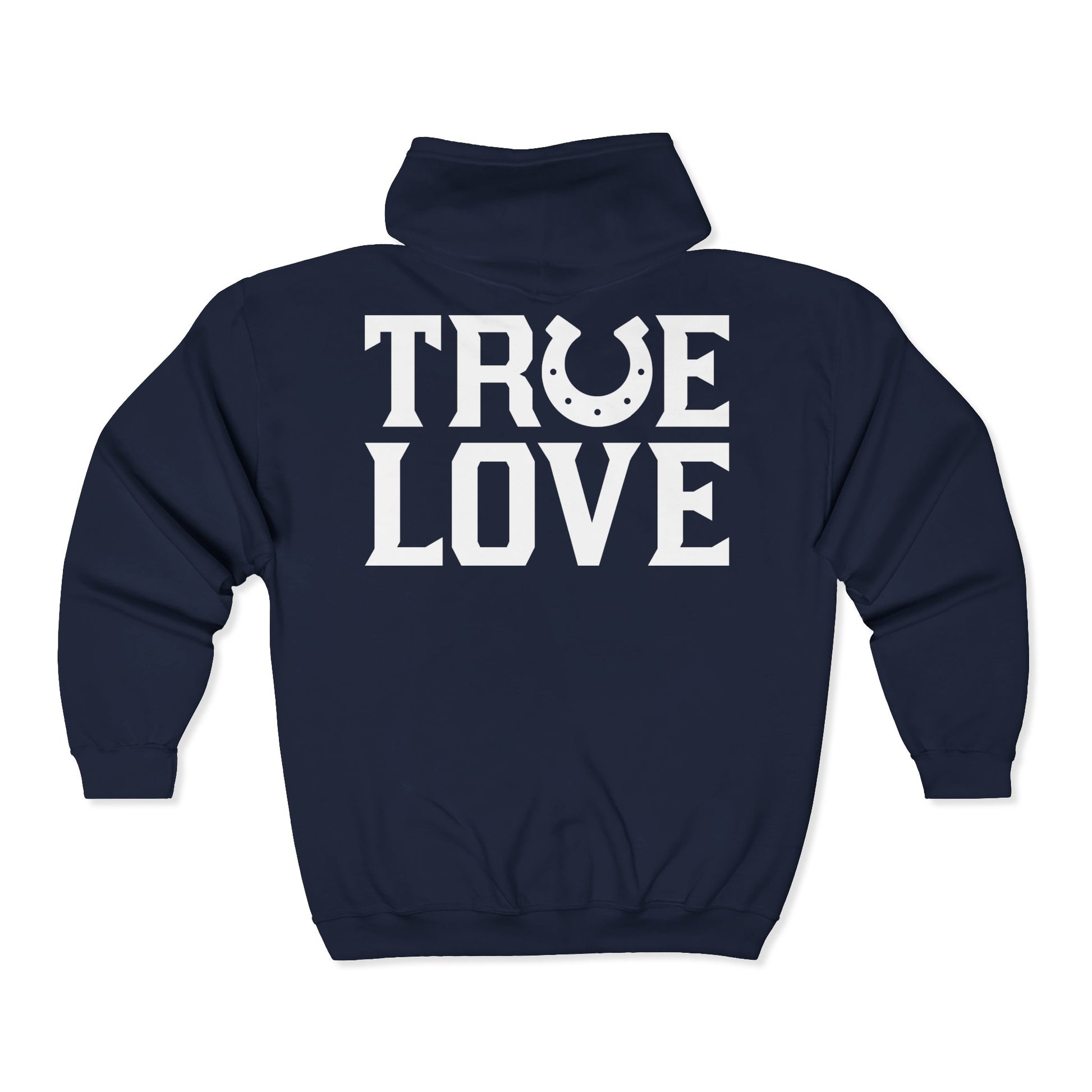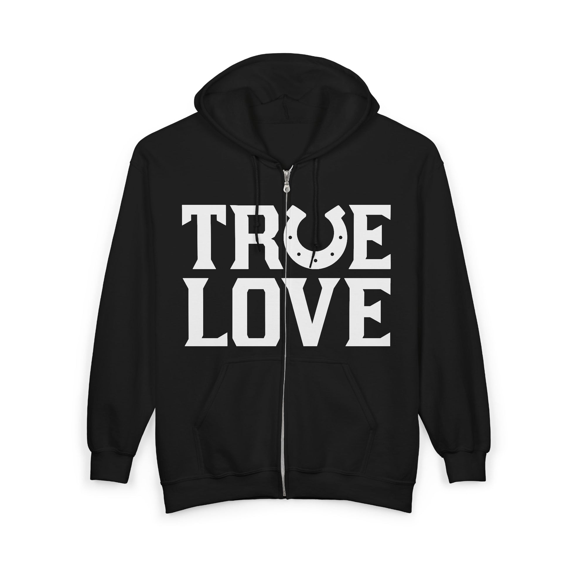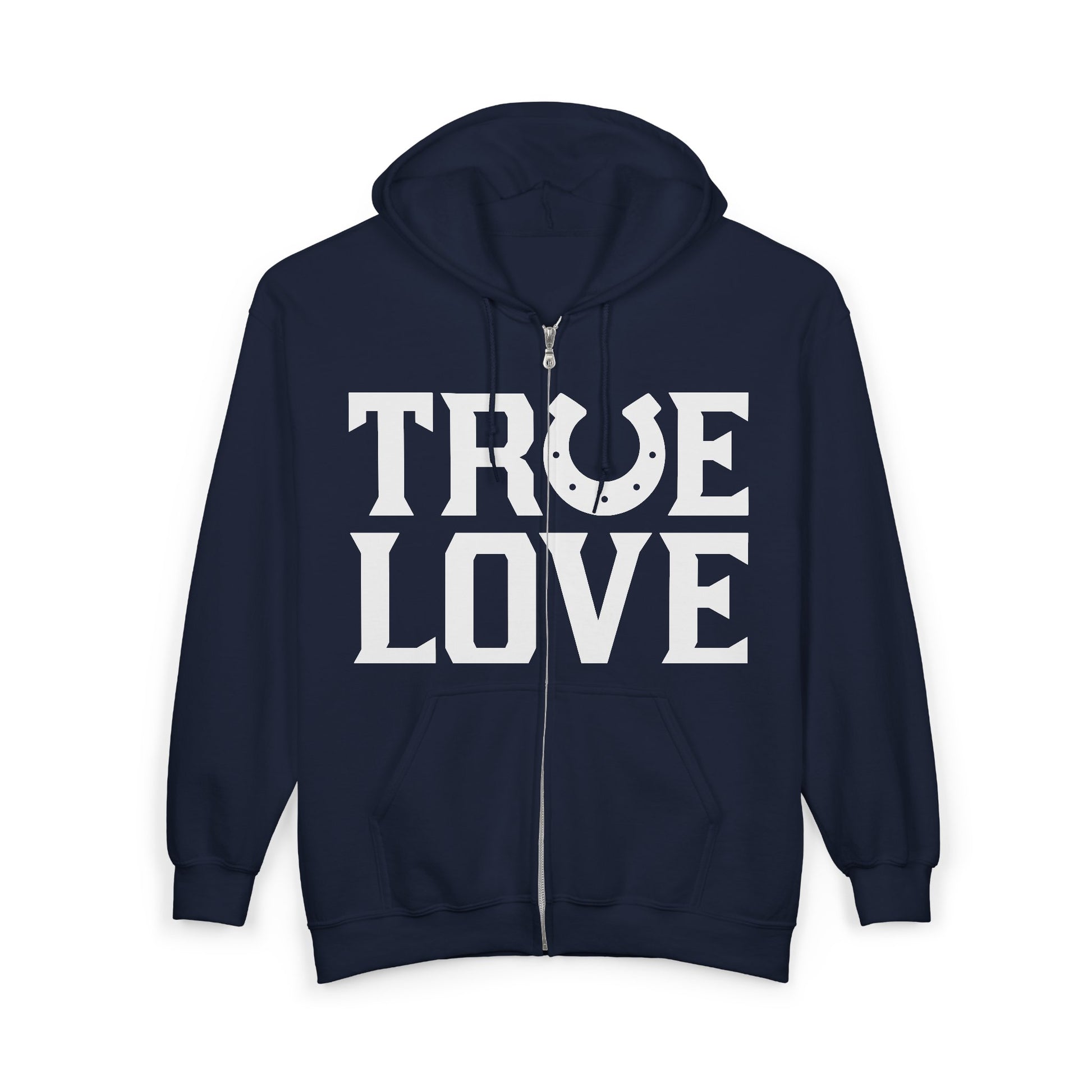 True Love Horseshoe Hoodie - Cozy Unisex Zip Sweatshirt for Equine Lovers, Perfect Gift for Horse Riders, Valentine's Day, Casual. The hoodie gives a warm and cozy vibe, perfect for chilly days spent at the stables or casual outings. It is relevant for horse enthusiasts, riders, and those who appreciate equestrian-inspired fashion. Ideal for Valentine's Day gifting or for anyone who loves horses.